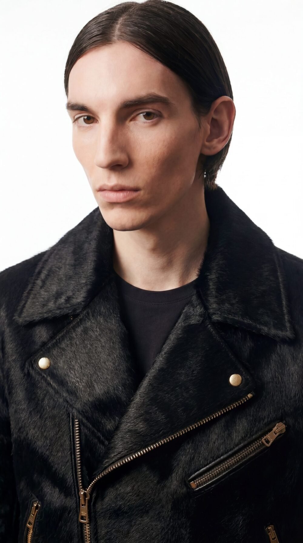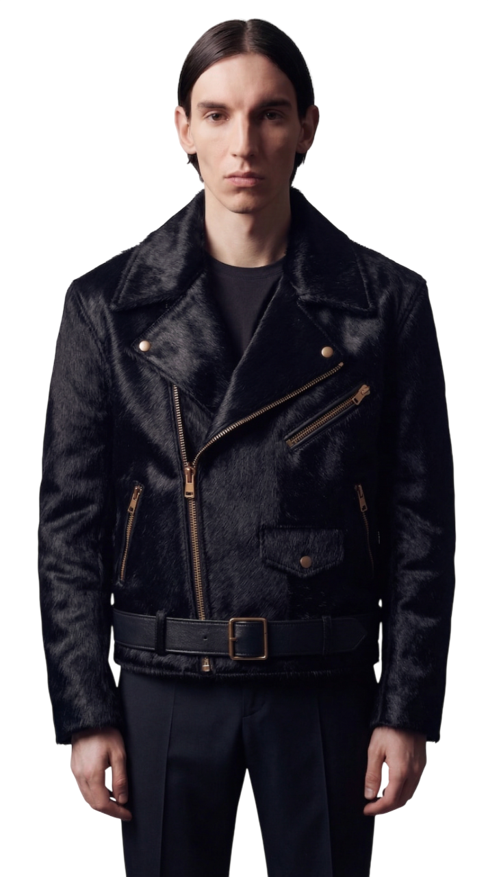 Asymmetric metal zippers, a substantial adjustable belt, and sharply defined pockets highlight the piece’s functional design