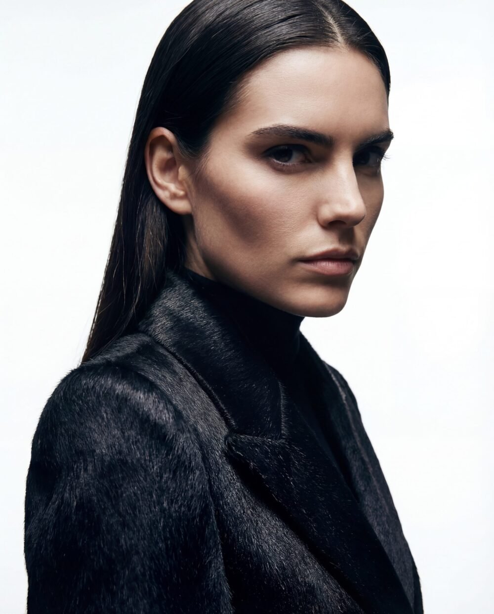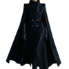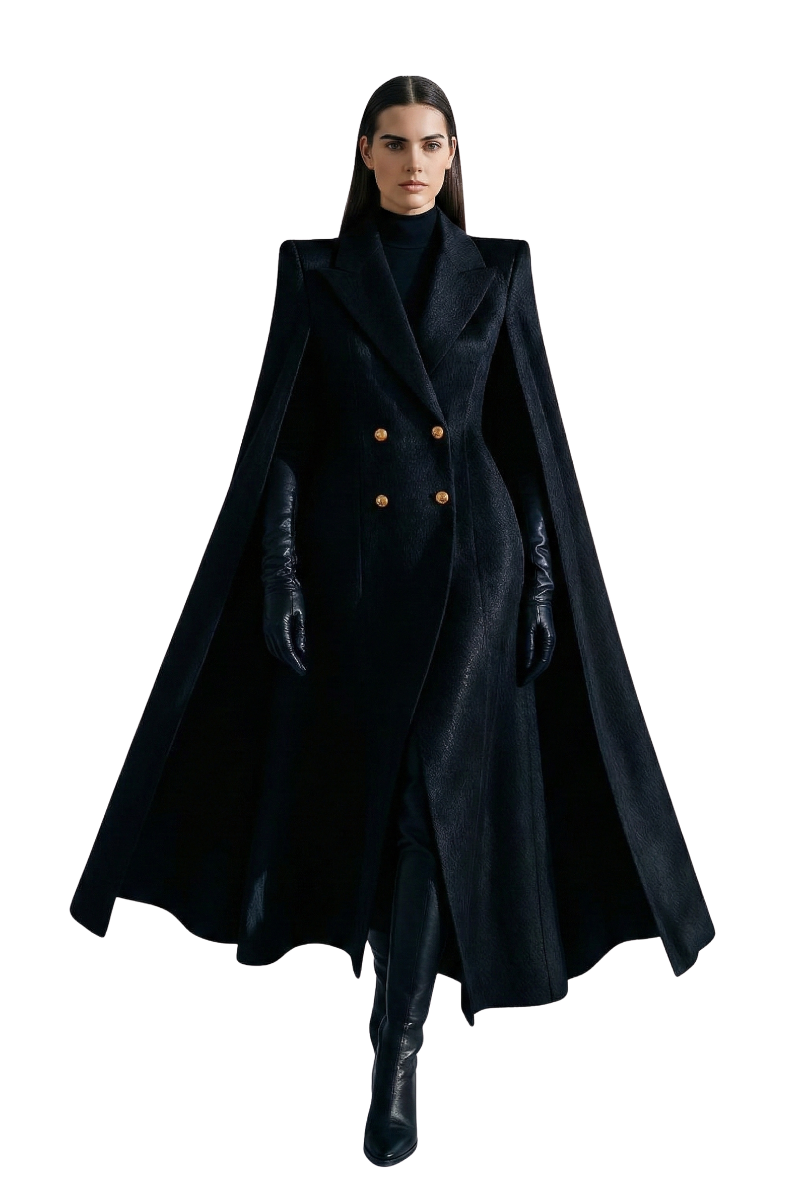 Designed with a strong, defined shoulder line and a clean, elongated silhouette, the cape envelops the body without restricting it. The front closure and proportions are calibrated to project presence, balance, and restraint a piece that does not seek attention, yet commands it.