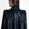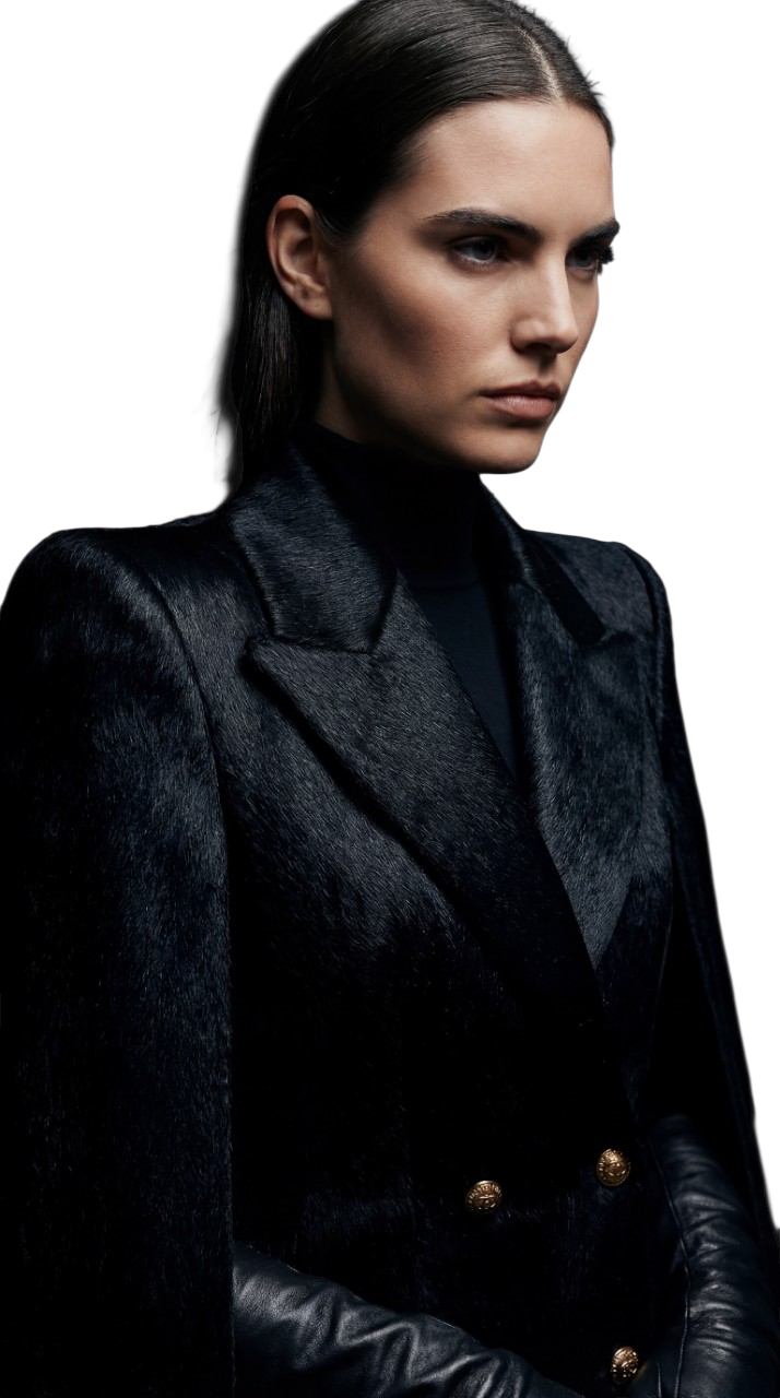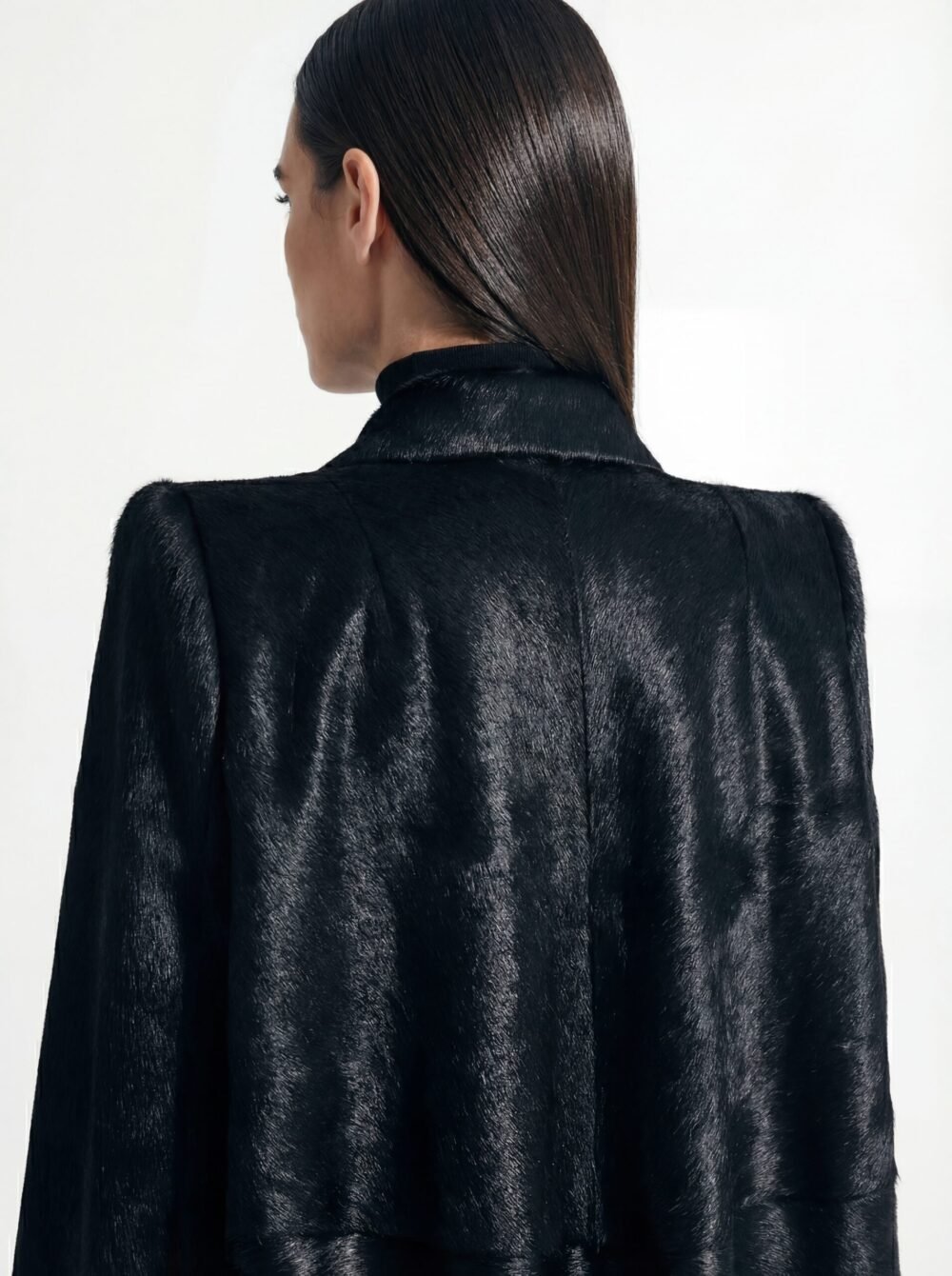 Crafted from black cowhide hair leather, each cape carries the natural depth and variation of the hide, making every piece inherently unique. The exterior reveals a rich, tactile surface with subtle movement and a natural sheen that responds to light rather than decoration.