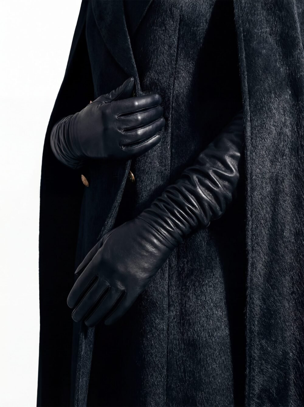 The interior is fully lined in black silk, chosen for its fluidity and contrast against the structured exterior. This duality creates a controlled drape, allowing the cape to move with authority while remaining precise and intentional.