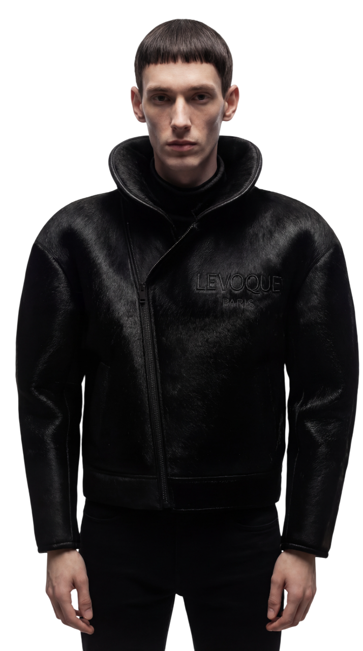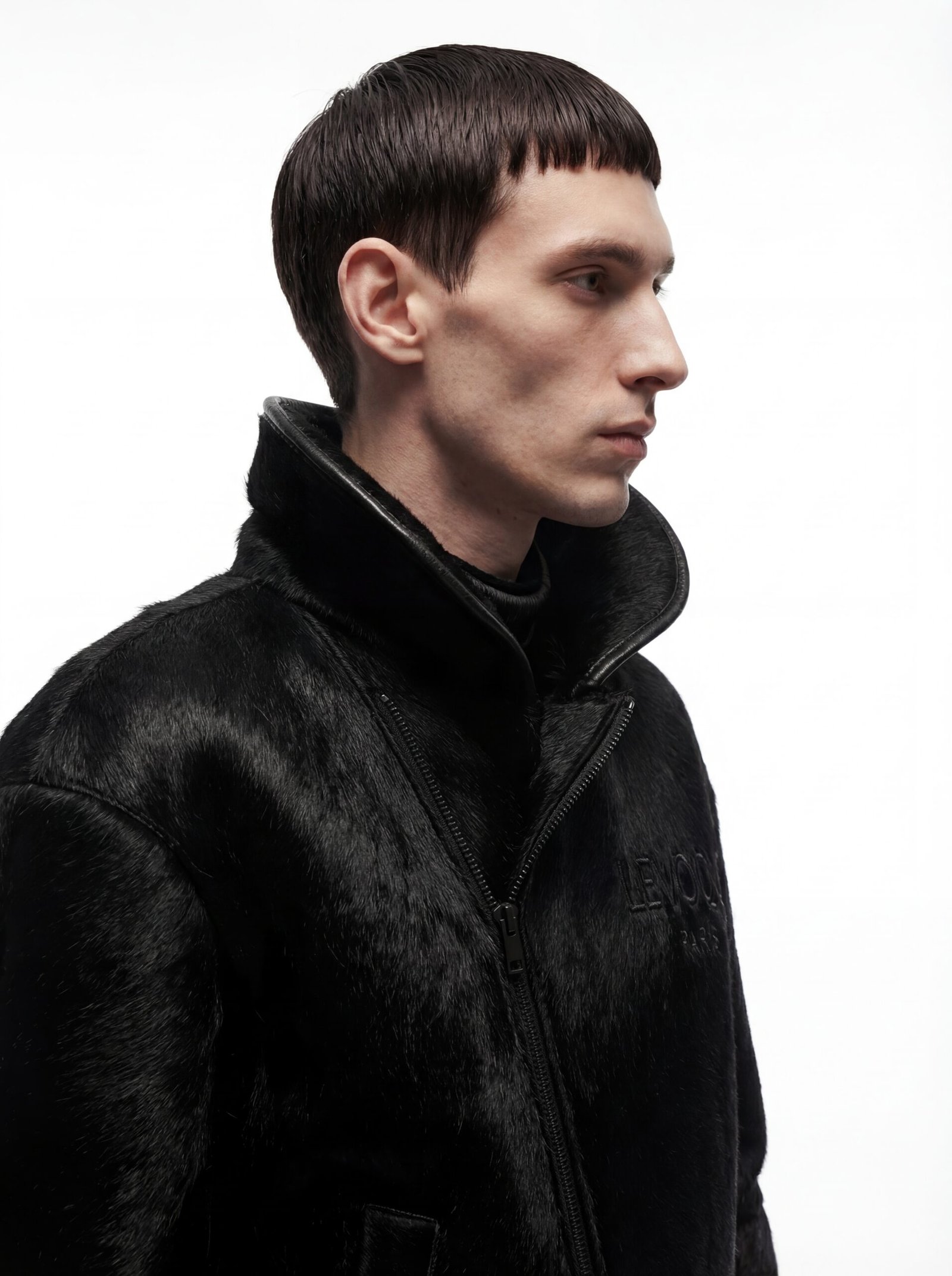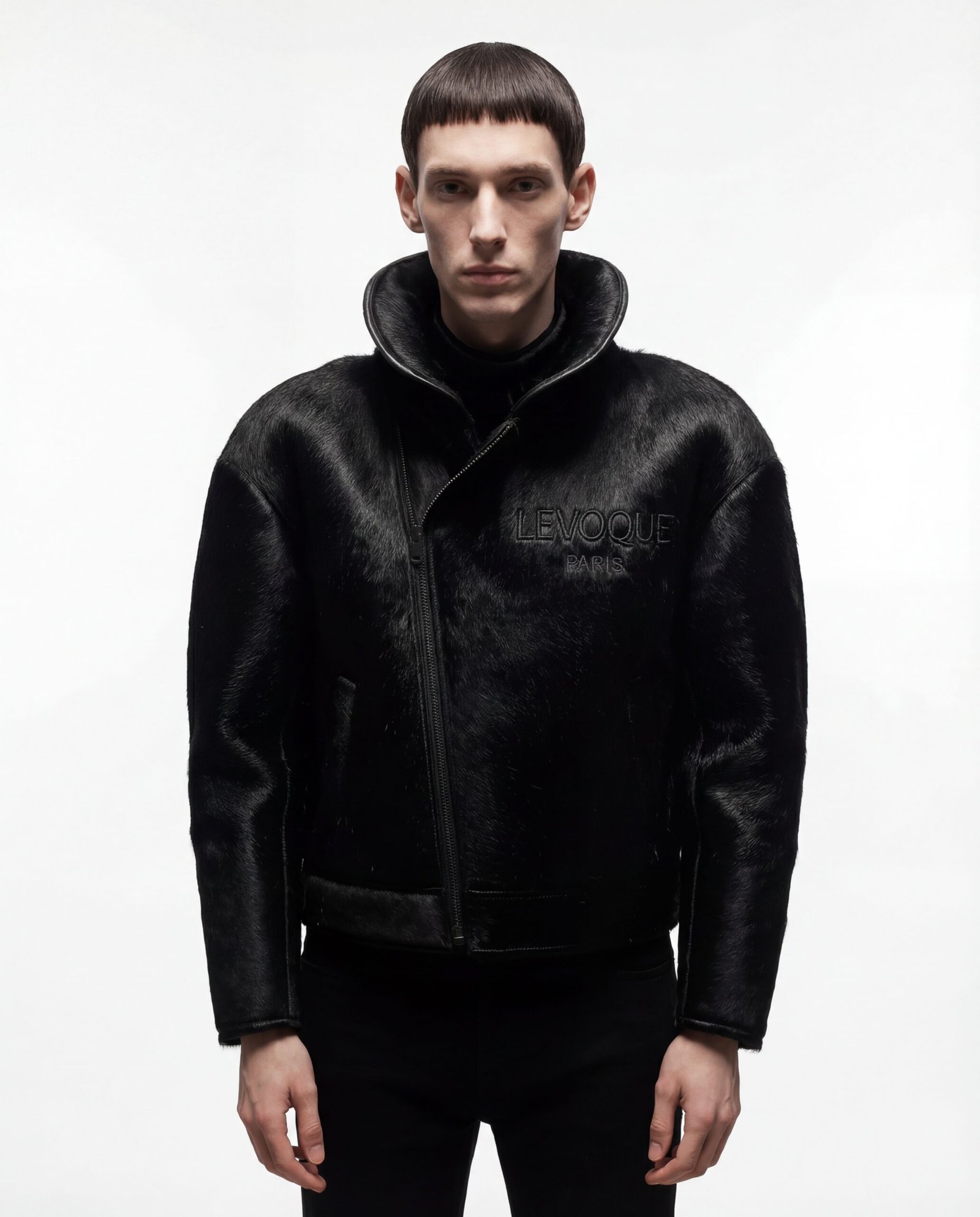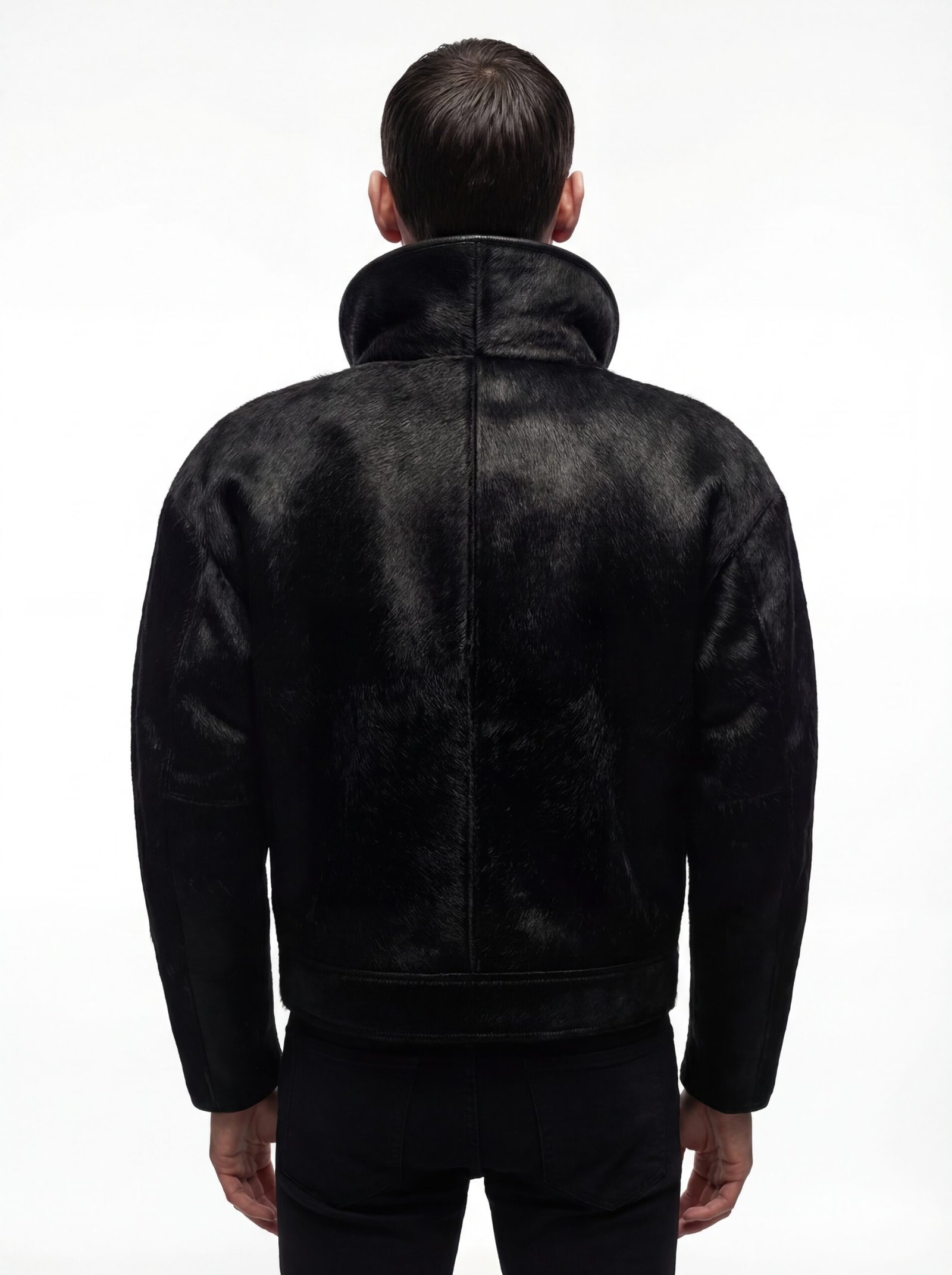 This jacket is constructed from black cowhide hair leather, selected for its natural depth, subtle sheen, and unique tactile presence. Each piece reveals the organic variations of the hide, ensuring no two jackets are ever identical.