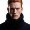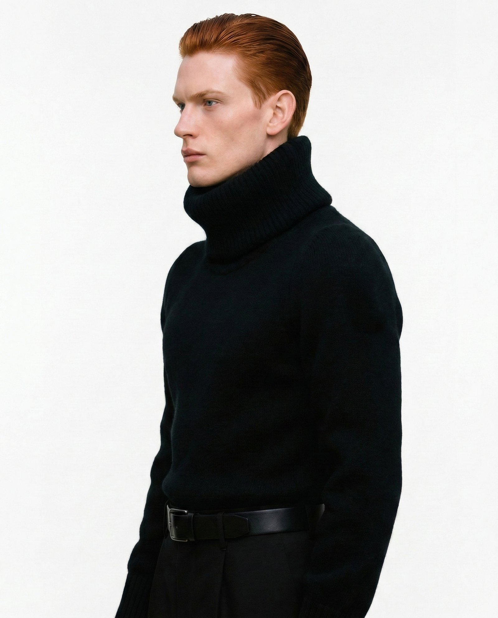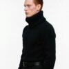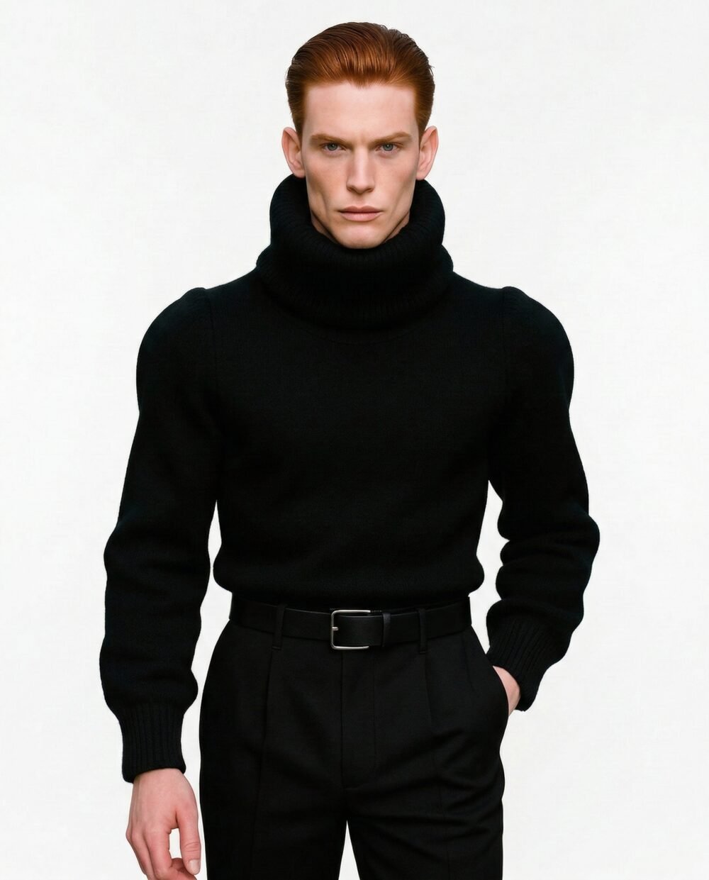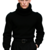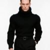This sweater is crafted from a rare blend of baby alpaca and silk, chosen for its exceptional softness, warmth, and innate structure. The silhouette is engineered with precision volume broad, sculpted shoulders, a sharply contoured waist, and an exaggerated, enveloping turtleneck that frames the face and projects a silent strength.