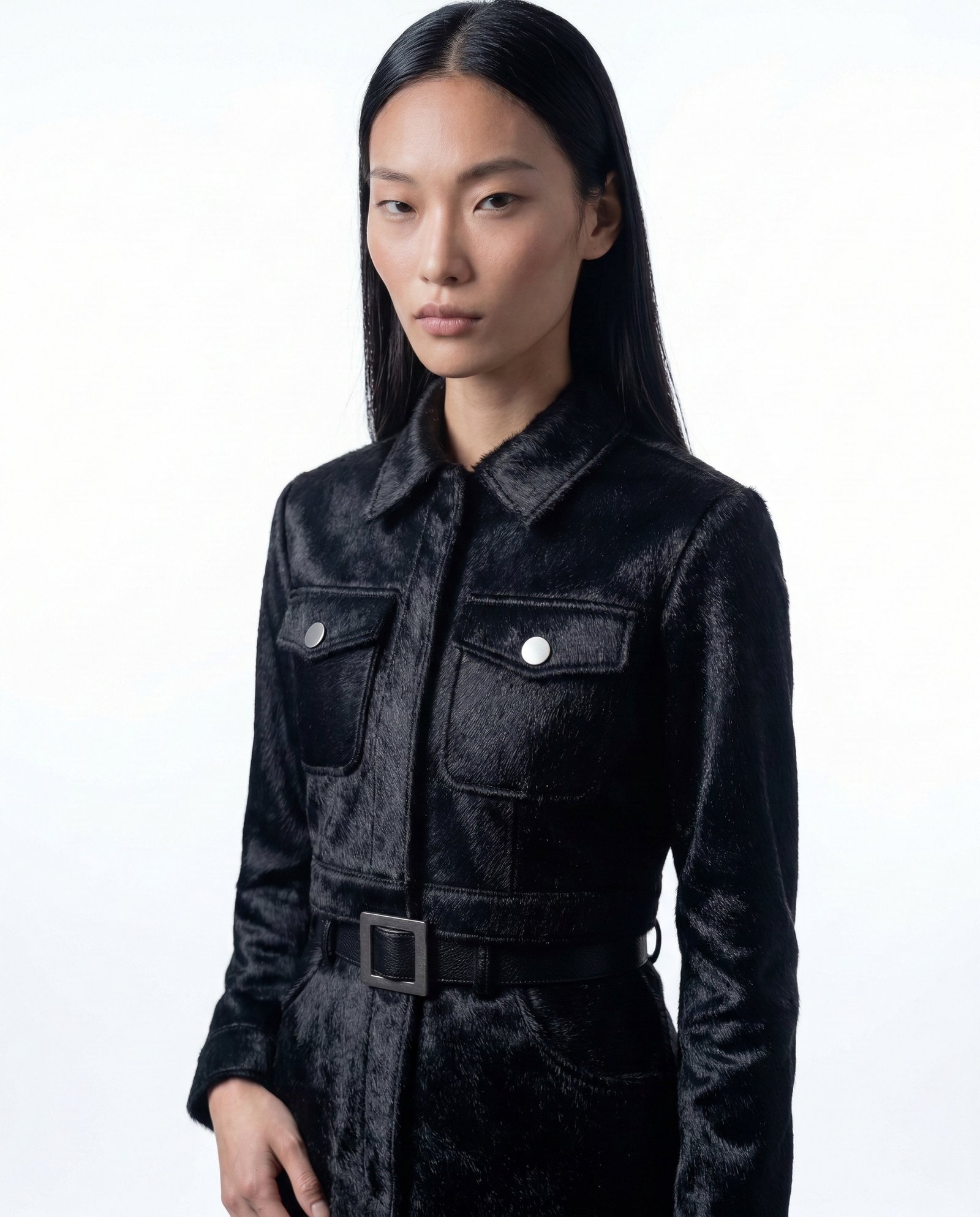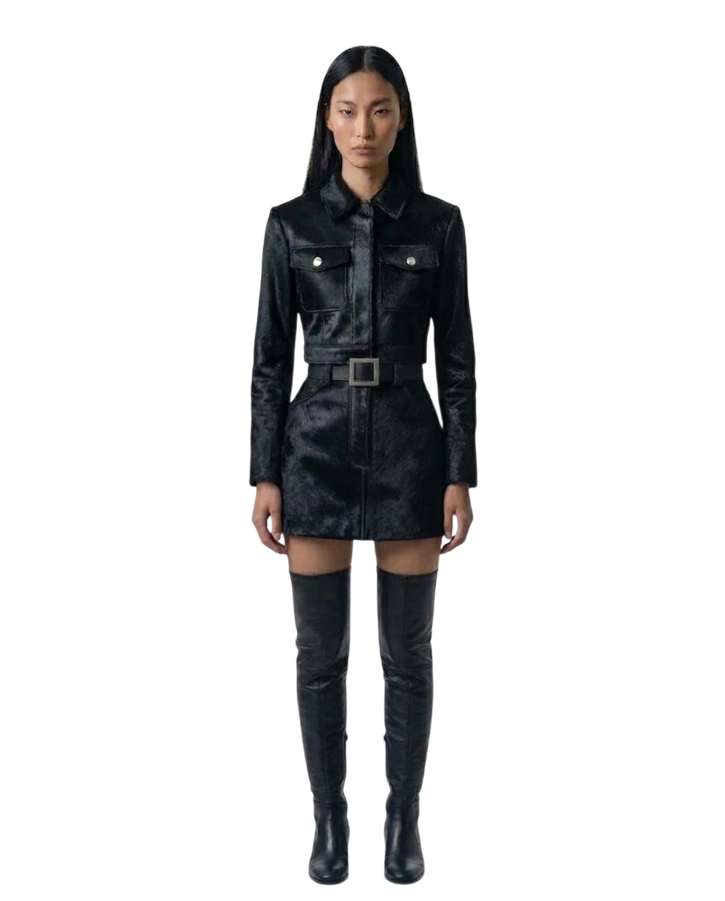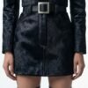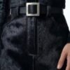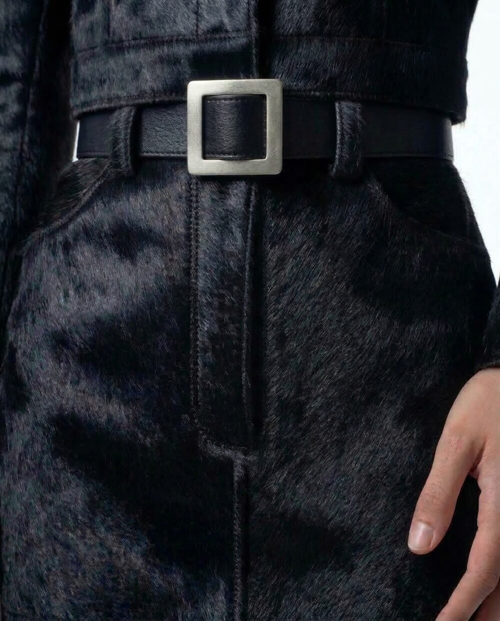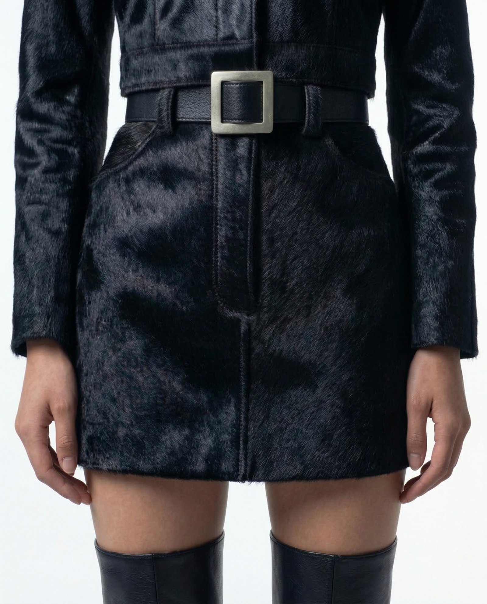 This skirt is crafted from black cowhide hair leather, selected for its dense texture, natural depth, and subtle movement. The hair-on surface introduces a tactile dimension that absorbs light, giving the piece a quiet yet commanding presence. Each skirt is inherently unique, shaped by the organic character of the hide.