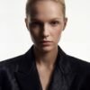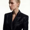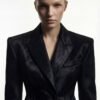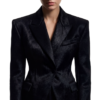 The front features a wide, peak lapel that frames the neckline, a single covered button that maintains the blazer’s clean line, and sharply cut flap pockets that add functional geometry. Every seam and panel is meticulously shaped to create a commanding three-dimensional presence.