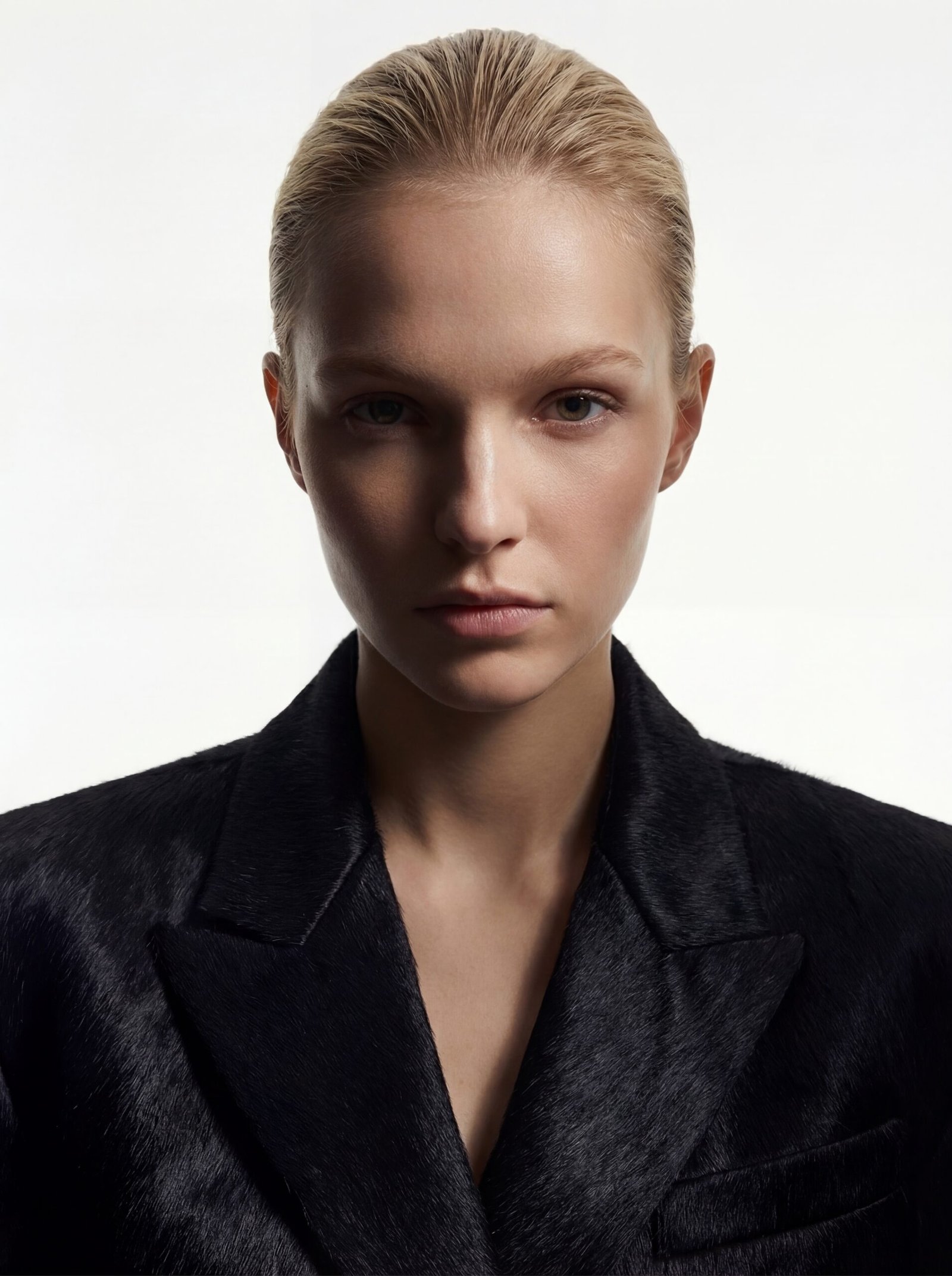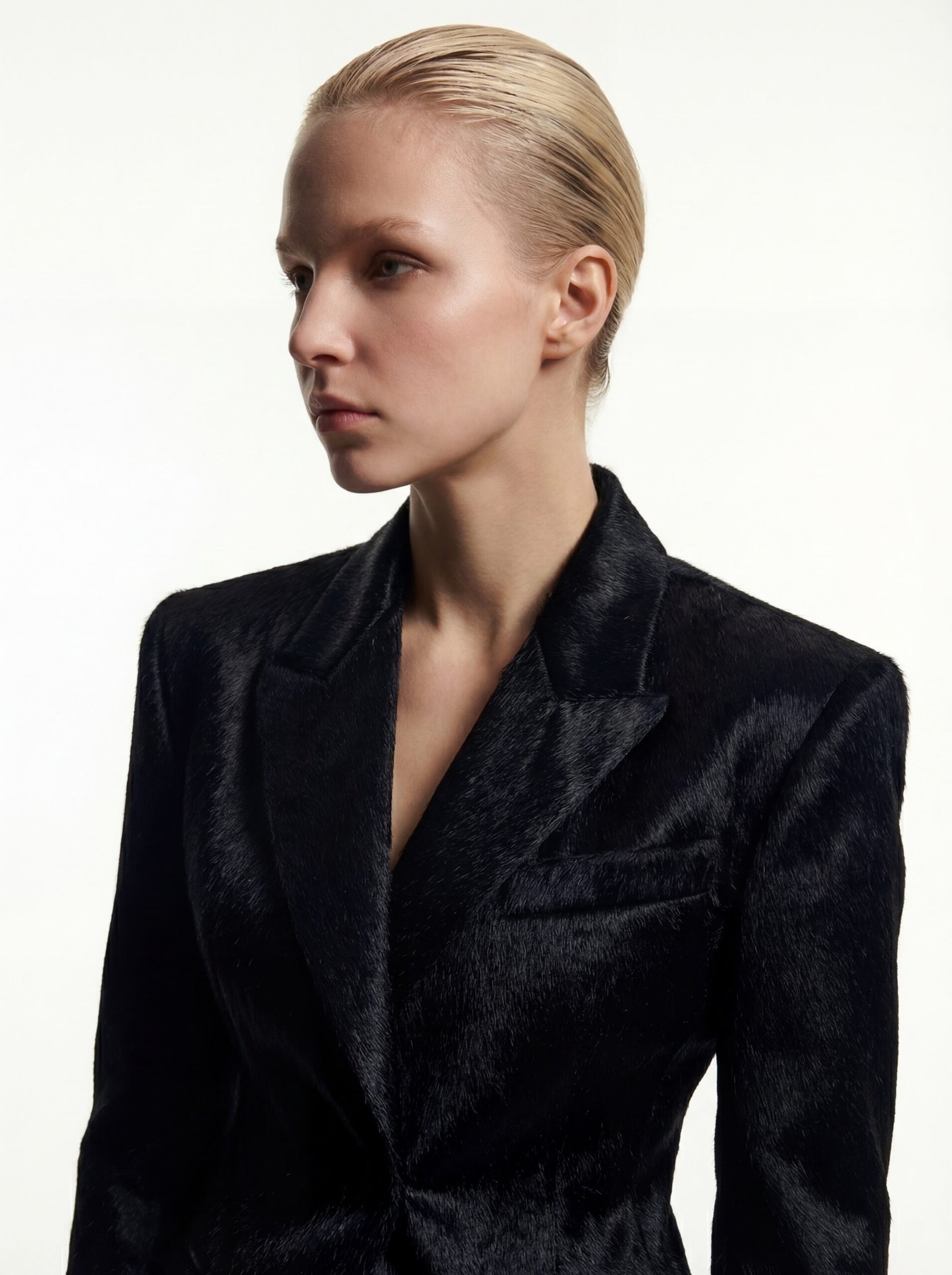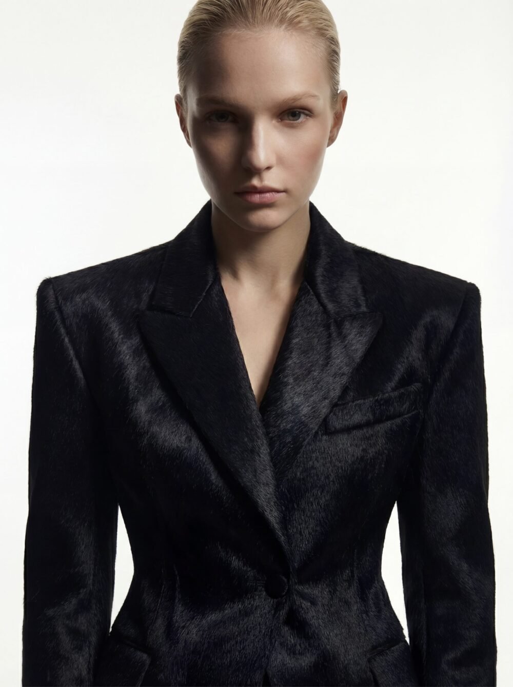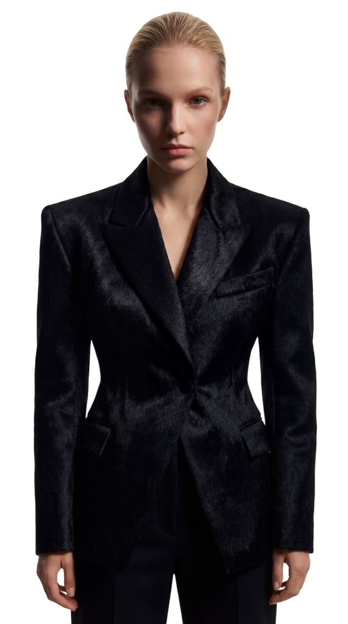 This blazer is constructed from black cowhide hair leather, selected for its dense, tactile surface and natural depth. The hide’s organic texture offers both visual richness and a subtly dynamic hand, making each piece one-of-a-kind.