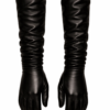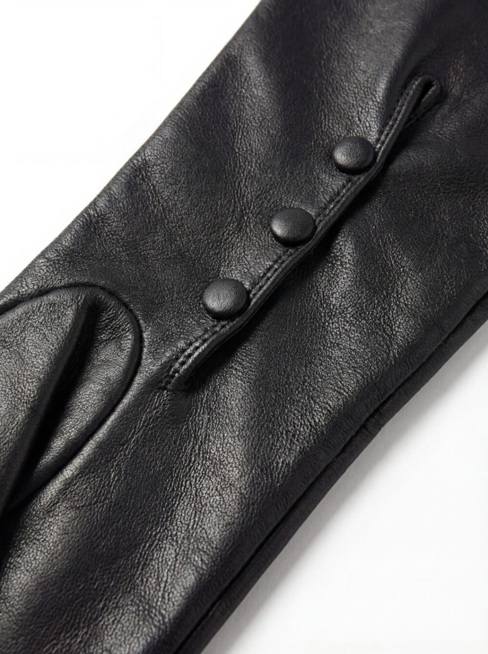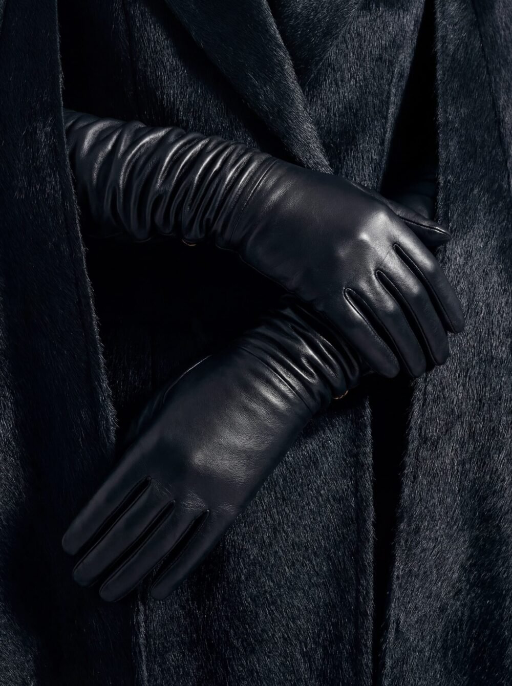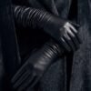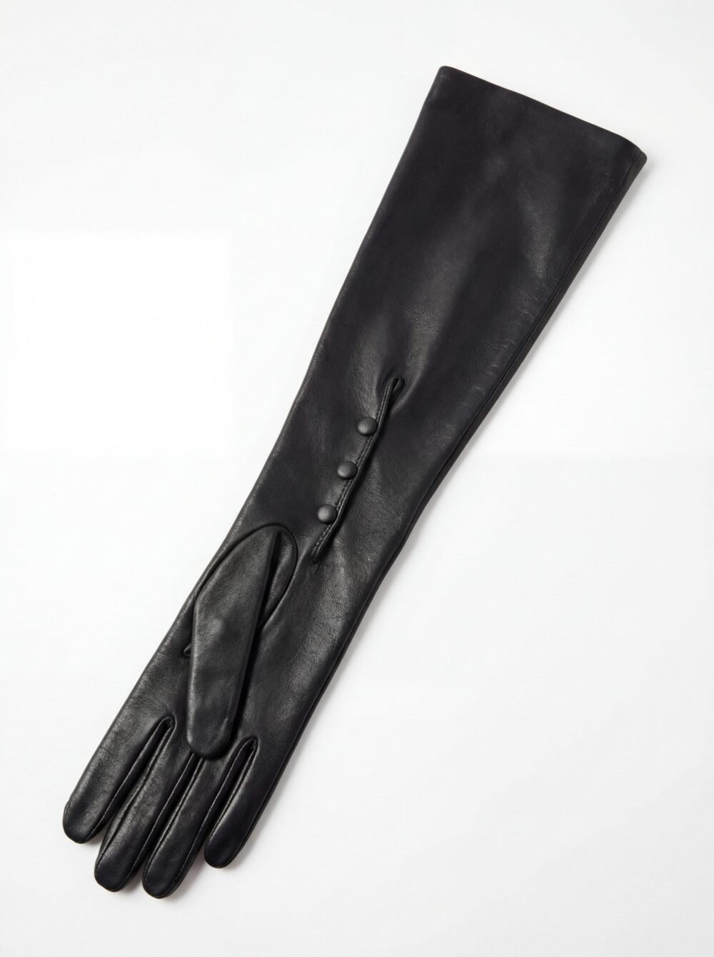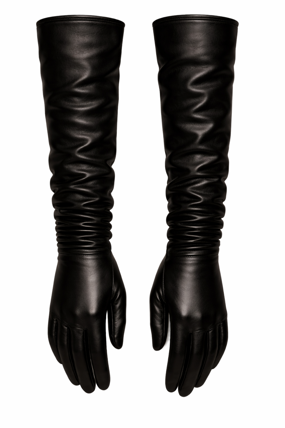 These gloves are crafted from supple,  black nappa leather, selected for its unparalleled softness, subtle sheen, and sculptural drape. Each pair is meticulously cut and hand-assembled, enveloping the arm in a continuous line that extends well above the elbow for a commanding, elegant presence.