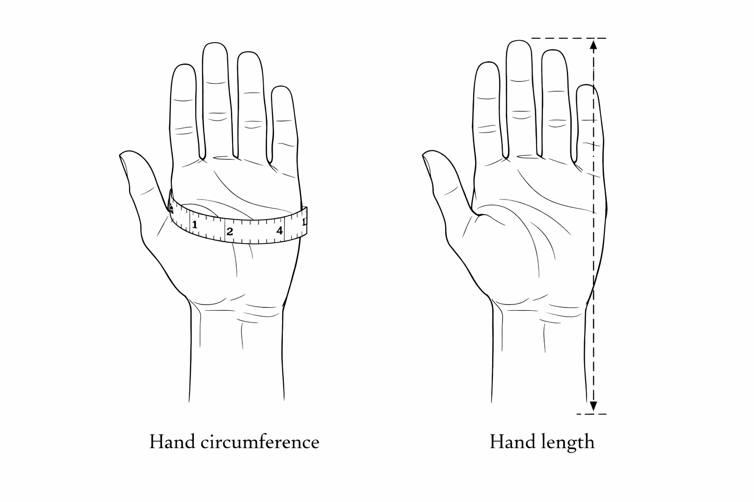 For the most accurate fit, measure your hand following the diagram below. Use a flexible tape measure and keep it comfortably snug, but not tight.